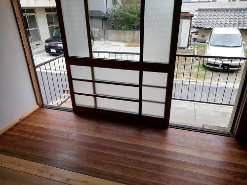 1F は 畳3畳に回りは杉板を張りました そして 腰壁 今まで使っていた古い廃材を取り出して 腰壁に。。。。。実にサスティナブルなリノベです もともと和室だったので 洋室と和室を混合して そして 仏間を最近のリモート用に PC ルームに変身 コンセントもついています